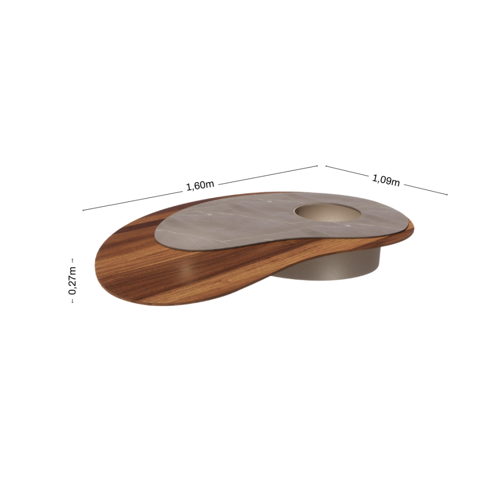 Utilizando signos da natureza que se traduzem em formas orgânicas e composições harmônicas, a mesa pétala é uma peça escultórica que combina diversos acabamentos em um conjunto exuberante que valoriza tanto a naturalidade dos materiais quanto a beleza das plantas em seu cachepô.